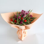 Şakayık, delfinyum, chrysanthemum, dahlia , lale, orkide ve çeşitli yeşillikler ile bezenmiş çiçek buketi
