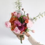Şakayık, delfinyum, chrysanthemum, dahlia ve çeşitli yeşillikler ile bezenmiş çiçek buketi